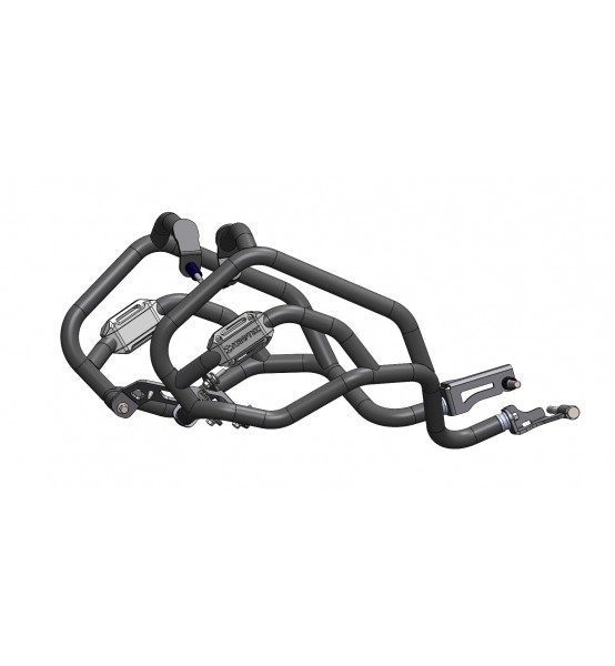 Las defensas laterales aseguran una protección eficaz contra golpes en eventuales caídas. Construidas en tubos en acero, capaces de soportar el uso extremo en off-road. Fijado en puntos de anclaje disponibles en la moto. Incluye toda la bulonería.