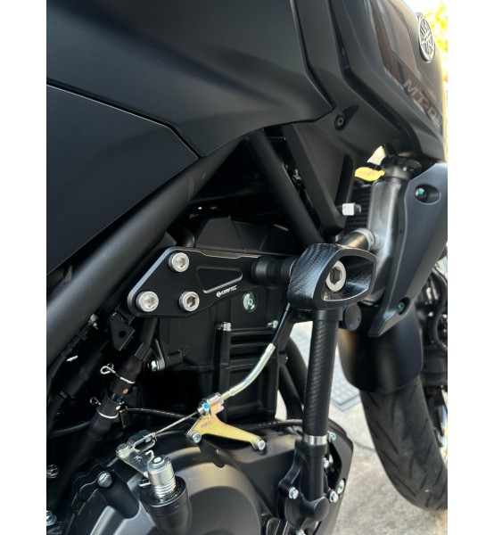 Realizado en un bloque único de Aluminio 6061 T6 mecanizado por CNC, y Delrin. Brindan protección a distintas zonas del carenado contra caídas leves y moderadas.